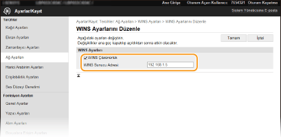 WINS sunucusunun IP adresi bir DHCP sunucusundan alınırsa, alınan IP adresi, [WINS Sunucu Adresi] metin kutusuna girilen IP adresini geçersiz kılar.