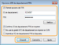 Feu-hi clic per verificar que s'han introduït l'ID i el PIN correctes. Aquesta funció no està disponible si l'equip i l'ordinador estan connectats mitjançant un port USB o WSD (Web Services on Devices).