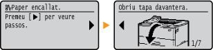 En alguns casos, quan es produeix un error, apareixen instruccions sobre com respondre a l'error. Seguiu les instruccions de la pantalla per solucionar el problema. A continuació s'ofereix com a exemple la pantalla que es mostra quan es produeix un encallament de paper.