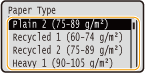 Формати паперу, зареєстровані під час виконання описаної вище процедури, відображаються на екрані вибору формату паперу для шухляди або багатоцільового лотка.