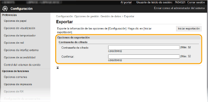 Introduzca una contraseña para cifrar los datos exportados con caracteres alfanuméricos. Introduzca la misma contraseña en [Confirmar]. Para exportar los datos, deberá establecer una contraseña de cifrado.