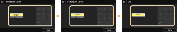 Log masuk ke dalam mesinJika anda cuba mengakses item yang memerlukan hak pentadbir, contohnya, <Rangkaian> dan <Tetapan Pengurusan>, apabila ID Pengurus Sistem ditentukan, skrin Log Masuk dipaparkan. Log masuk ke dalam mesin