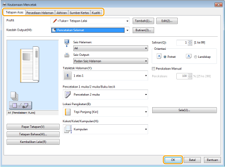 Tentukan tetapan cetakan sebagaimana diperlukan dan klik [OK].