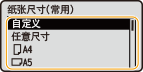 如果装入纸张时未显示以上画面如果一直将相同的纸张装入多功能托盘,可以通过将纸张尺寸和类型注册为默认设置来跳过纸张设置操作。不过,注册了默认设置时,将不会显示以上画面。若要显示此画面,请选择 <装入纸张时指定> (为多功能托盘注册默认的纸张设置)。