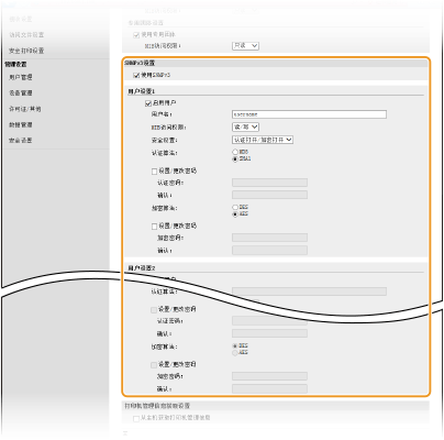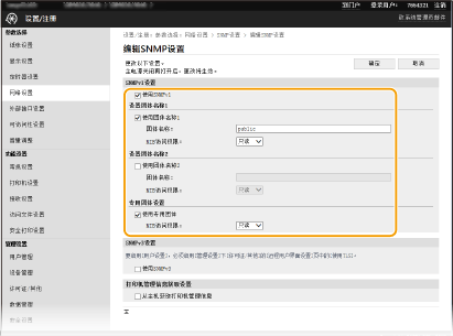 简单网络管理协议(SNMP)是用于通过管理信息库(MIB)监视和控制网络中通信设备的协议。本机支持 SNMPv1 和安全性增加的 SNMPv3。当您打印文档或使用远程用户界面时,可以从计算机检查本机的状态。您可以启用 SNMPv1 或 SNMPv3,或同时启用两者。根据您的网络环境和用途指定各版本的设置。