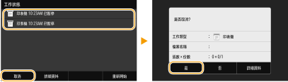 從遠端使用者介面取消可以從遠端使用者介面的 [工作狀態] 頁面取消列印:檢查列印文件的目前狀態
