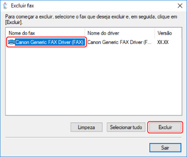 [Limpeza]: Clique nesta opção para excluir simultaneamente todos os arquivos e informações de registro relativos a todos os drivers exibidos na lista, não apenas ao driver selecionado. Clique em [Excluir] para executar uma desinstalação normal do driver.