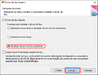 Selecione [Atualizar drivers de fax existentes] para [Processo para instalar o driver de fax] → clique em [Avançar].