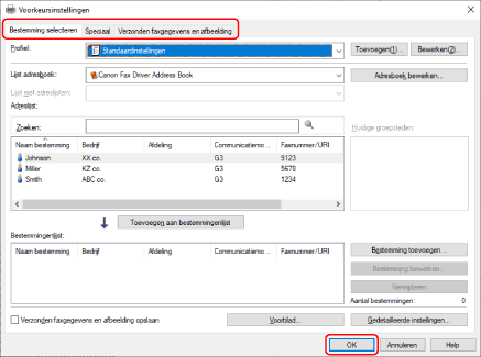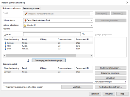 Kies een bestemming in het scherm [Instellingen faxverzending].