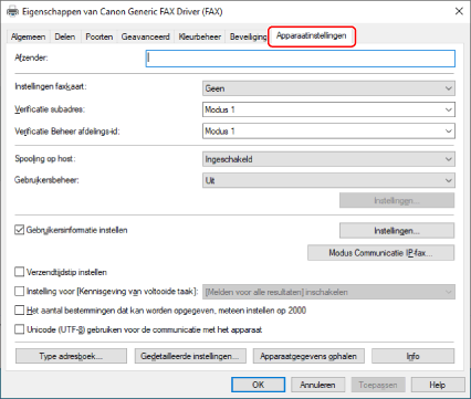 De apparaatfunctie en -opties werden niet correct ingesteld in het tabblad [Apparaatinstellingen].