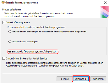 Selecteer [Bestaande faxstuurprogramma's bijwerken] voor [Proces voor het installeren van het faxstuurprogramma] → klik op [Volgende].