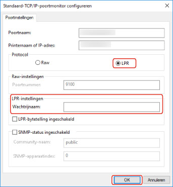 (1) Selecteer [LPR] voor [Protocol] → specificeer één van de afdrukwachtrijen voor [Wachtrijnaam] in [LPR-instellingen].