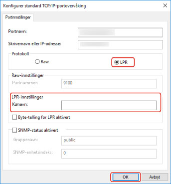 (1) Velg [LPR] for [Protokoll] → spesifiser én av skriverkøene for [Kønavn] i [LPR-innstillinger].