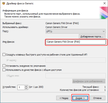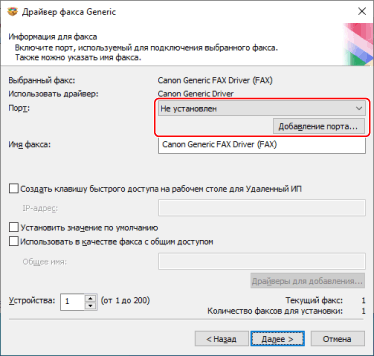 Если добавлен или выбран порт сетевого принтера, невозможно задать [Имя факса] и [Использовать в качестве факса с общим доступом].