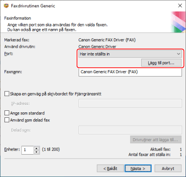 Om du har lagt till eller valt en nätverksskrivarport kan du inte ange [Faxnamn] och [Använd som delad fax].