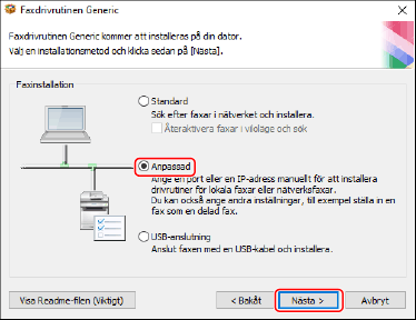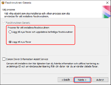 [Process för att installera faxdrivrutinen]: Välj detta vid behov om det redan finns en installerad drivrutin.
