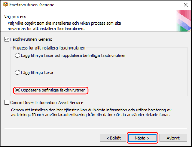 Välj [Uppdatera befintliga faxdrivrutiner] för [Process för att installera faxdrivrutinen] → klicka på [Nästa].