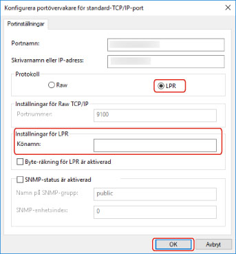 (1)Välj [LPR] för [Protokoll] → ange en av utskriftsköerna för [Könamn] i [Inställningar för LPR].