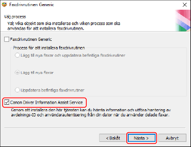 Avbryt valet av drivrutin → välj [Canon Driver Information Assist Service] → klicka på [Nästa].