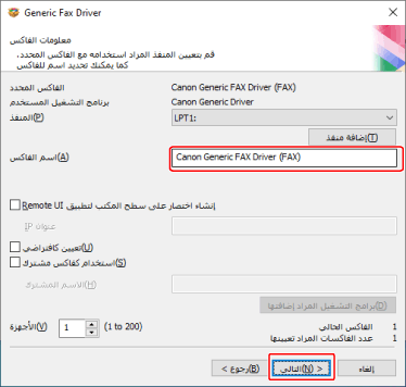قم بتغيير [اسم الفاكس] إذا لزم الأمر ← انقر فوق [التالي].
