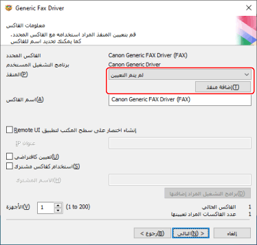 إذا قمت بإضافة أو اختيار منفذ طابعة شبكة، لن يمكنك ضبط [اسم الفاكس] و [استخدام كفاكس مشترك].
