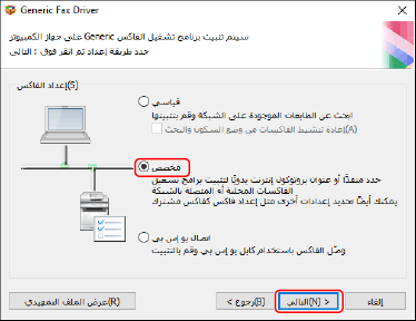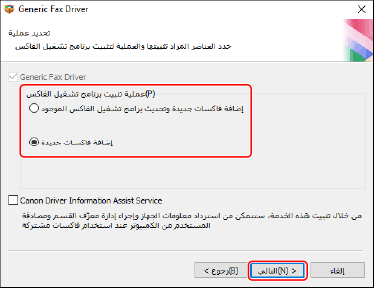 [عملية تثبيت برنامج تشغيل الفاكس]: اختر هذا عند الضرورة إذا تم تثبيت مثبت برنامج التشغيل بالفعل.