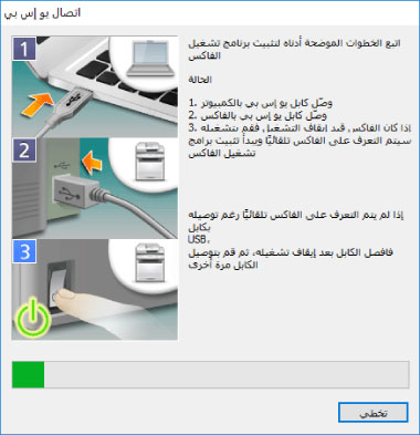 عند ظهور الشاشة التالية، قم بتوصيل الجهاز والكمبيوتر بواسطة كابل USB ← قم بتشغيل الجهاز.
