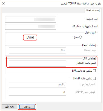 (1) اختر [LPR] لـ [البروتوكول] ← حدد إحدى قائمات انتظار الطباعة [اسم قائمة الانتظار] في [إعدادات LPR].