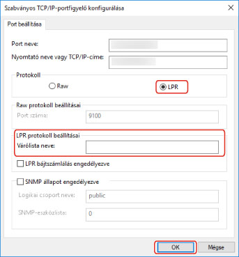 (1) Válassza az [LPR] lehetőséget a [Protokoll] menüpontban → adja meg a nyomtatási sorok valamelyikét az [Várólista neve] [LPR protokoll beállításai] beállításnál.