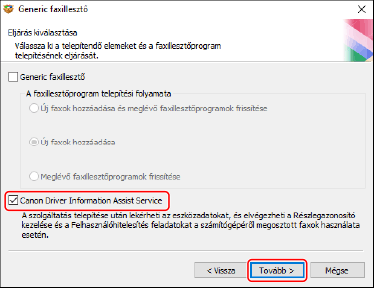 Szüntesse meg az illesztőprogram kijelölését → válassza a [Canon Driver Information Assist Service] elemet → kattintson a [Tovább] gombra.