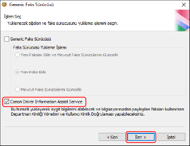 Sürücü seçimini iptal edin → [Canon Driver Information Assist Service] öğesini seçin → [İleri] düğmesini tıklatın.