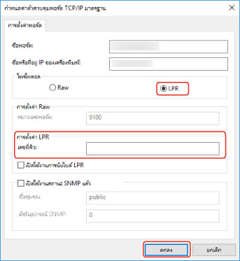 (1) เลือก [LPR] สำหรับ [โพรโทคอล] → ระบุคิวการพิมพ์คิวใดคิวหนึ่งสำหรับ [เลขที่คิว] ใน [การตั้งค่า LPR]