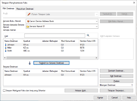 Tentukan destinasi dari skrin [Tetapan Penghantaran Faks] yang dipaparkan.