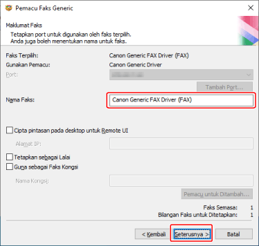 Jika anda ingin menukar nama peranti atau menetapkannya sebagai peranti lalai, pilih [Tetapkan Maklumat Faks] → klik [Seterusnya].