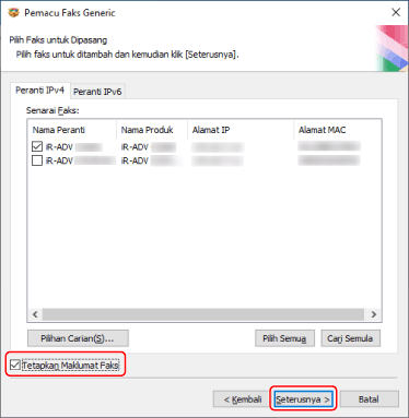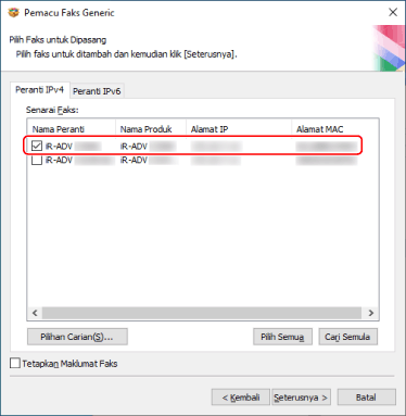 [Cari Semula]: Klik ini jika peranti tidak dipaparkan dalam [Senarai Faks]. Jika peranti masih tidak dipaparkan selepas carian semula, pilih [Tersuai] dan pasang dengan menentukan port atau alamat IP.