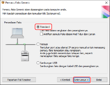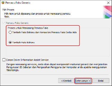[Proses untuk Memasang Pemacu Faks]: Pilih ini jika perlu dan jika pemacu sudah dipasang.
