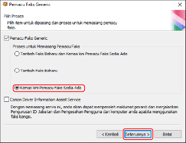 Pilih [Kemas kini Pemacu Faks Sedia Ada] untuk [Proses untuk Memasang Pemacu Faks] → klik [Seterusnya].