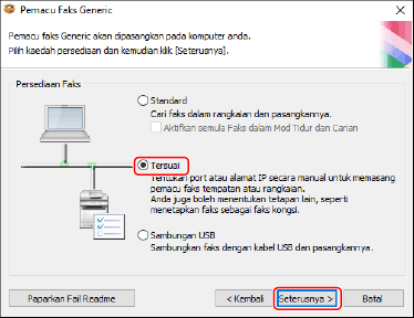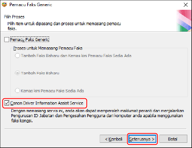 Ini menerangkan prosedur untuk memasang Canon Driver Information Assist Service untuk secara automatik menetapkan fungsi pemulihan maklumat peranti. Untuk mendayakan penggunaan fungsi pemulihan maklumat peranti selepas pemacu telah dipasang, ikut prosedur ini.
