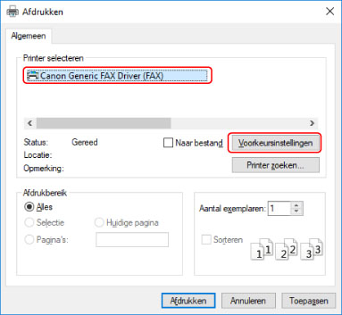 Als u geen gedetailleerde instellingen voor faxoverdracht nodig hebt, klik dan op [Afdrukken] of [OK] en ga verder met stap
