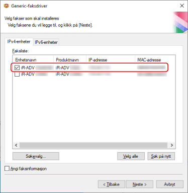Velg enheten du skal installere fra [Faksliste].