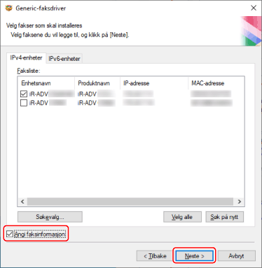 Hvis du vil endre navn på enheten, eller angi den som standardenhet, velg [Angi faksinformasjon] → klikk på [Neste].
