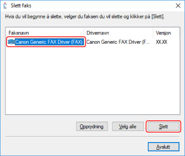 [Opprydning]: Klikk på denne for samtidig å slette alle filer og all registerinformasjon relatert til alle driverne som vises i listen, ikke bare den valgte driveren. Klikk på [Slett] for å utføre en normal avinstallering av driveren.