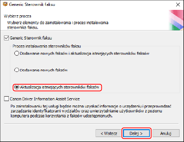 Wybierz pozycję [Aktualizacja istniejących sterowników faksów] w obszarze [Proces instalowania sterowników faksu] → kliknij przycisk [Dalej].