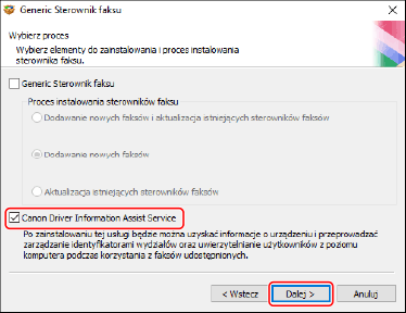 Anuluj wybór sterownika → zaznacz opcję [Canon Driver Information Assist Service] → kliknij przycisk [Dalej].