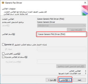 إذا كنت تريد تغيير اسم الجهاز أو ضبط الجهاز كجهاز افتراضي، اختر [تعيين معلومات الفاكس] ← انقر [التالي].