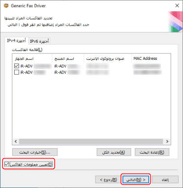 [إعادة البحث]: انقر على هذا عند عدم عرض الجهاز في [قائمة الفاكسات]. عند عدم عرض الجهاز حتى بعد إعادة البحث، اختر [مخصص] وقم بالتثبيت عن طريق تحديد منفذ أو عنوان IP.