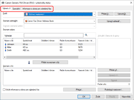 Výchozí nastavení můžete změnit na požadovaná nastavení faxového přenosu. Pokud je změníte na často používaná nastavení, můžete snížit náročnost konfigurace nastavení při tisku.