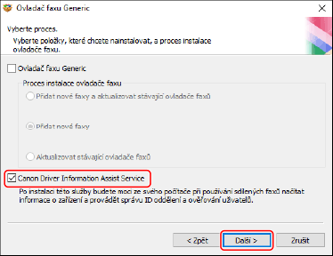 Zrušte výběr ovladače → zvolte službu [Canon Driver Information Assist Service] → klikněte na tlačítko [Další].