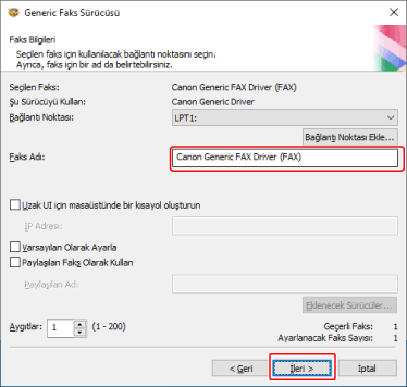 Gerekirse [Faks Adı]'nı değiştirin → [İleri] düğmesine tıklayın.