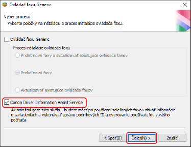 Zrušte výber ovládača → vyberte [Canon Driver Information Assist Service] → kliknite na [Ďalej].